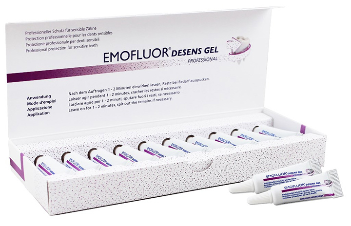 Гель EMOFLUOR® DESENS GEL призначений для лікування зубів із підвищеною чутливістю. У ньому задіяна така властивість технології CUROLOX®, як висока здатність склеювання з поверхнею зуба, завдяки якій на дентині формується ефективний захисний бар'єр. А це, своєю чергою, швидко захищає від хворобливих подразників.