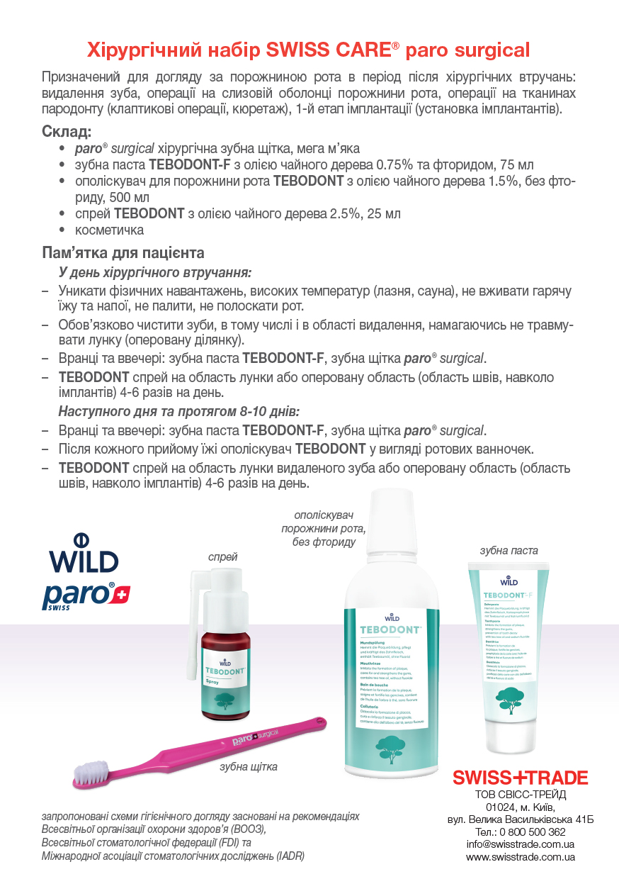 Призначений для догляду за ротовою порожниною в період після хірургічних втручань: видалення зуба, операції на слизовій оболонці порожнини рота, операції на тканинах пародонту (клаптеві операції, кюретаж), 1-й етап імплантації (установка імплантатів).
