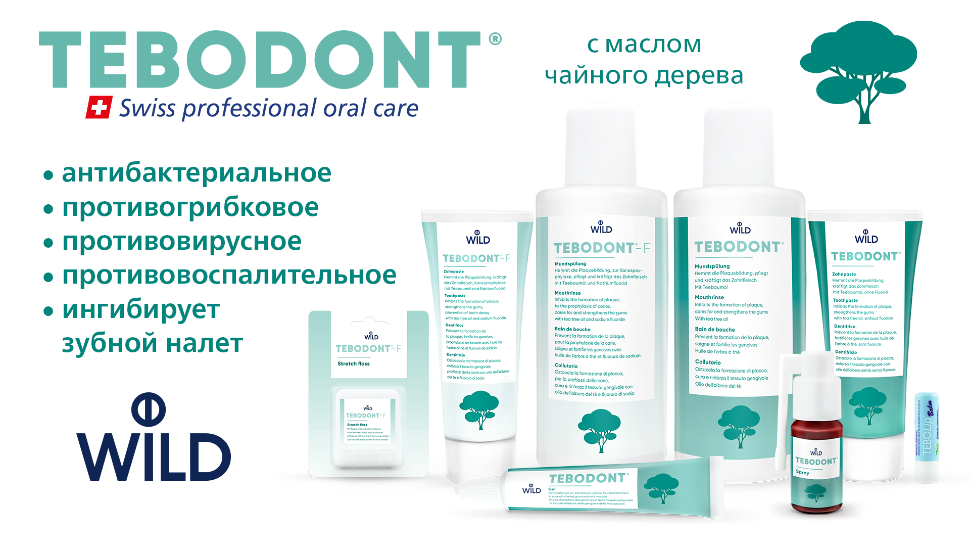 Антимікробна дія олії чайного дерева відома вже давно. Наприклад, під час Другої світової війни австралійські солдати використовували олію чайного дерева для обробки ран та захисту від інфекцій. Сьогодні олія австралійського чайного дерева успішно використовується в спеціально розробленій компанією Wild Pharma продукції під брендом TEBODONT®. Ця продукція застосовується як альтернатива натурального походження в стоматології для лікування та профілактики. Вона рекомендована стоматологами та стоматологами-гігієністами для забезпечення оптимальної гігієни зубів та порожнини рота. Дослідження2 з використанням TEBODONT® показали, що інфекції в області рота та горла успішно подавляються, а мікроорганізми знищуються.