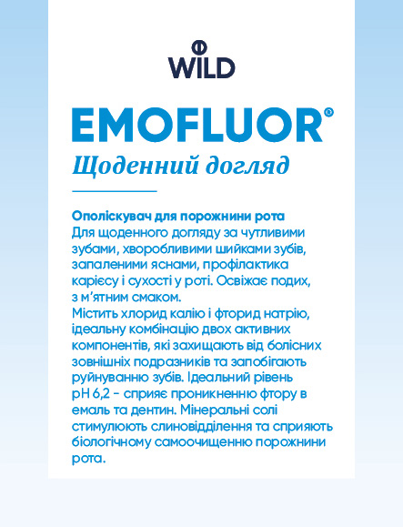 EMOFLUOR® Ежедневный уход Ополаскиватель для полости рта содержит хлорид калия и фторид натрия, идеальную комбинацию двух активных компонентов, которые защищают от болезненных внешних раздражителей и предотвращают разрушение зубов.
