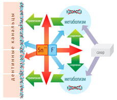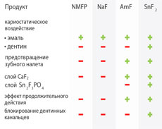 Для профилактики кариеса и снижения гиперчувствительности зубов используются различные соединения фторидов. Наиболее поверхностное действие (только на эмаль) оказывают монофосфат натрия и фторид натрия. Более глубоким действием обладает аминофторид. Самым же сильным и пролонгированным действием обладает стабилизированный фторид олова, который оказывает действие не только на эмаль, но и на дентин. |