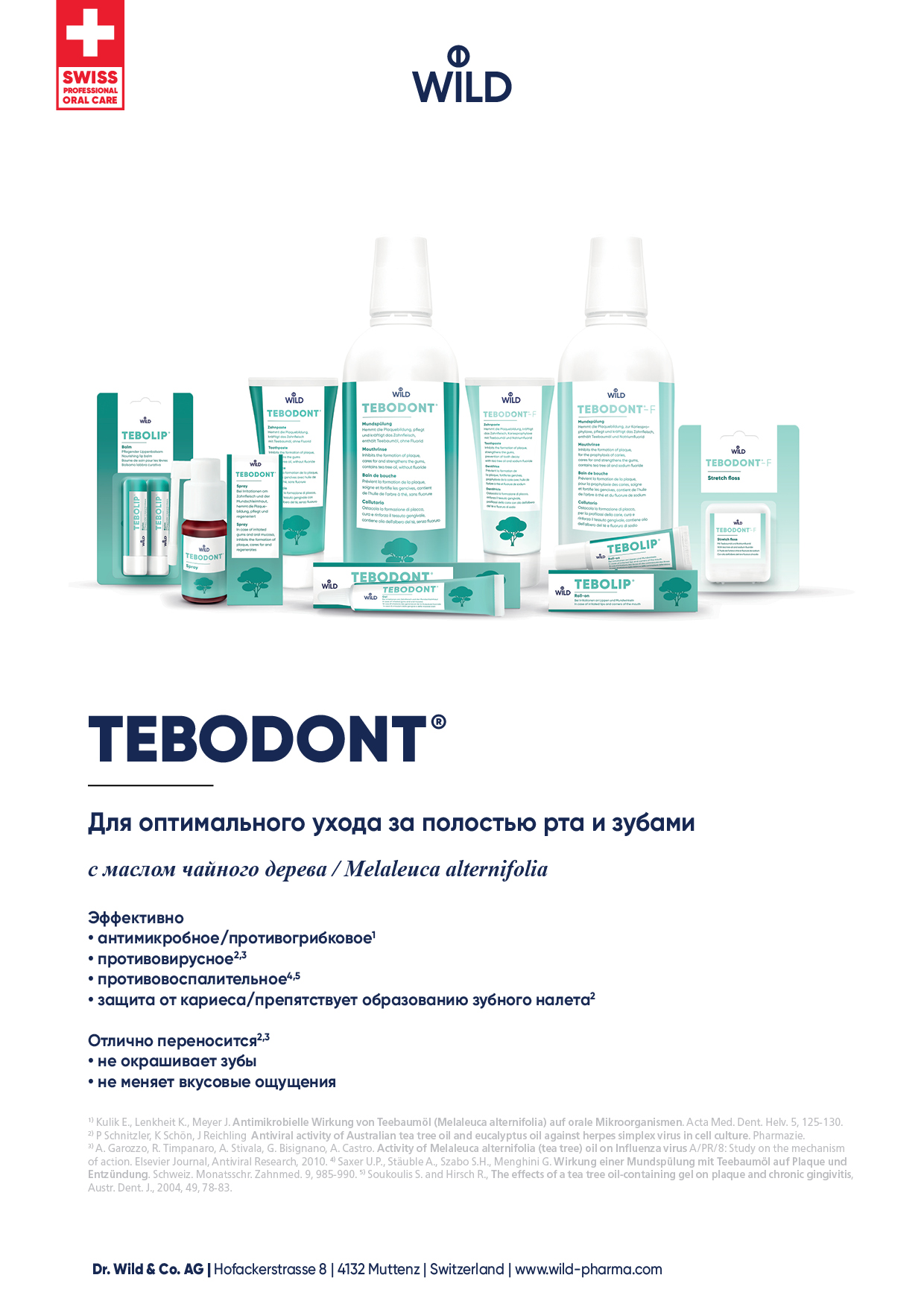 В составе линейки продукции TEBODONT® содержится масло чайного дерева (Melaleuca alternifolia) в оптимальных концентрациях, обладающее хорошо известным антибактериальным, противогрибковым и противовирусным действием.